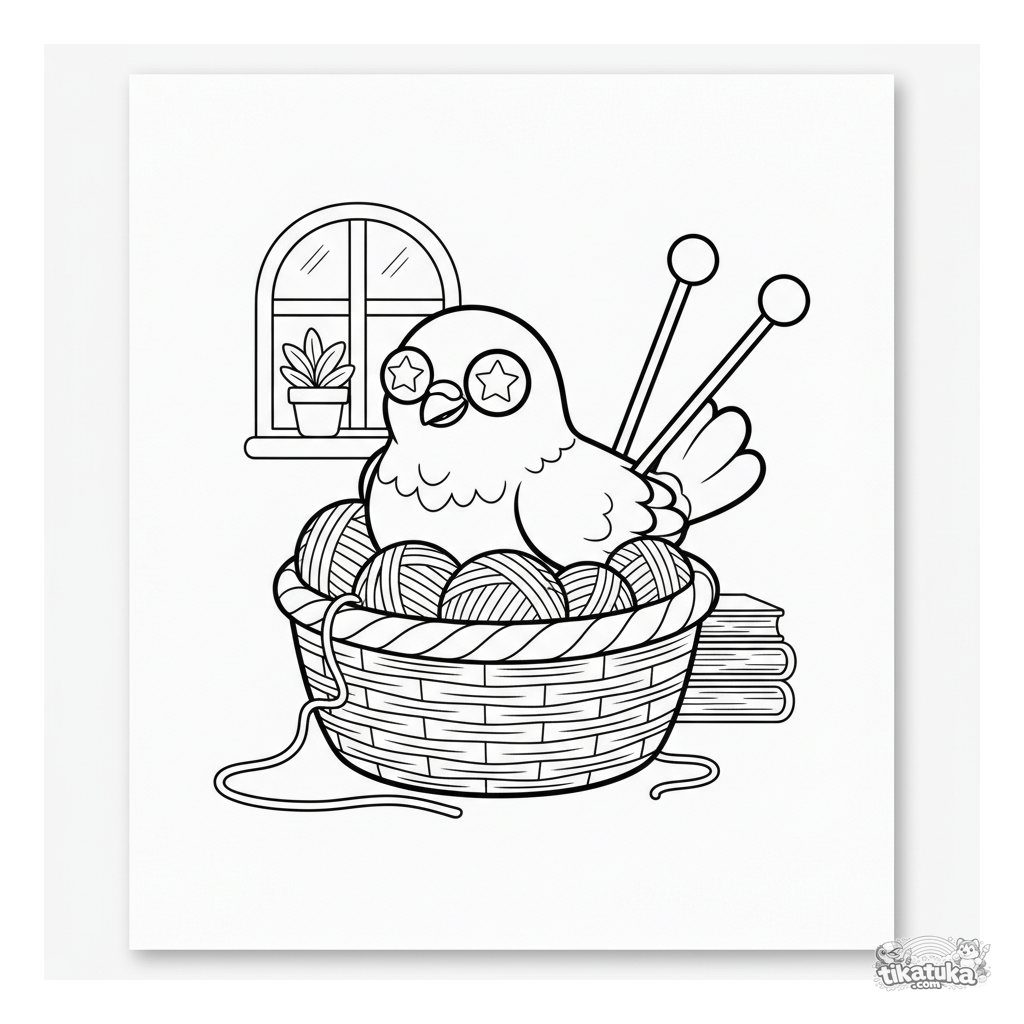 Раскраска с глупым голубем, устроившим уютное гнездышко в корзинке с пряжей. Для детей 4-6 лет. Милая домашняя сцена, простые линии, спокойный персонаж.
