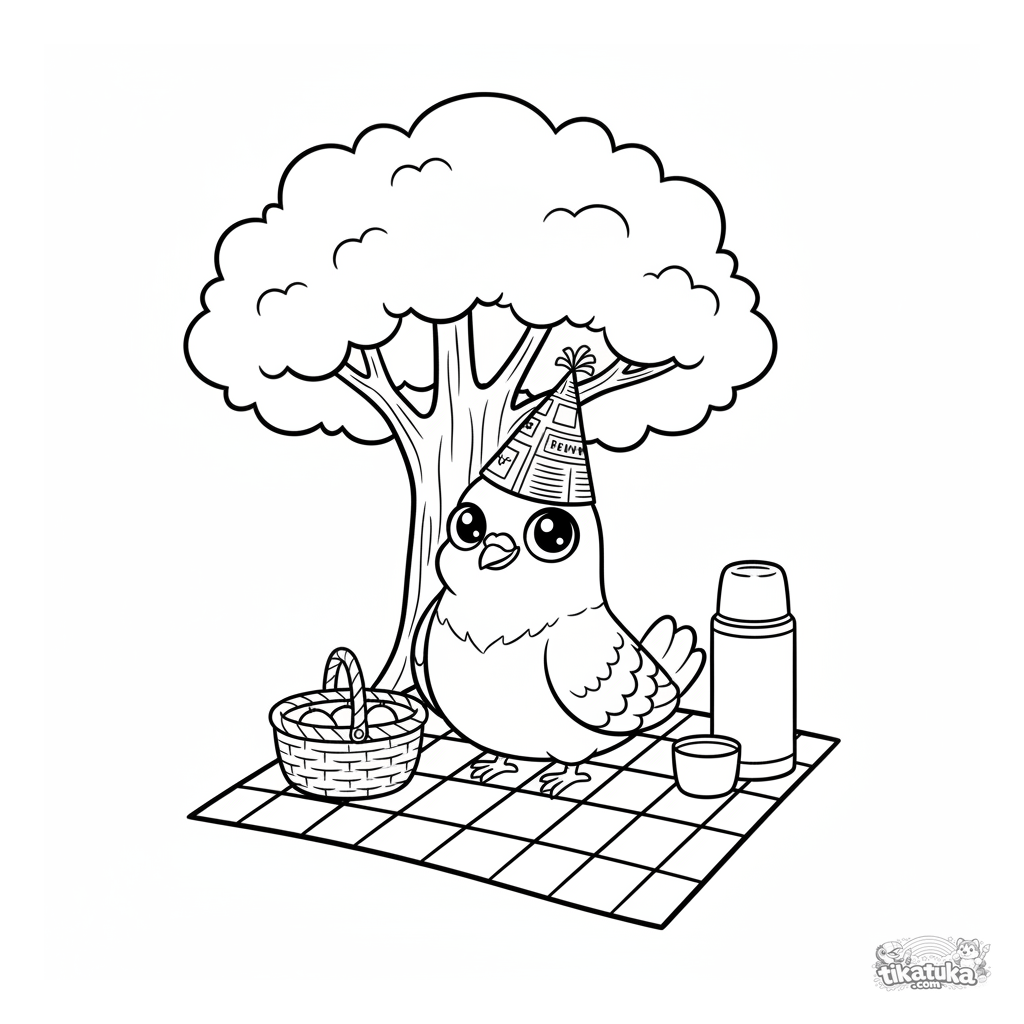 Раскраска с глупым голубем в бумажной шляпе на веселом пикнике в парке. Для детей 4-6 лет. Праздничная сцена, забавный наряд, простые детали.