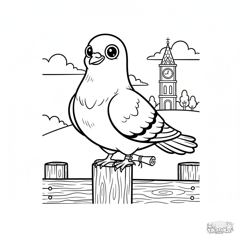 Раскраска с глупым голубем-почтальоном, готовящимся к полету со свитком на лапке. Для детей 4-6 лет. Сцена с чувством долга, простые детали, городской фон.