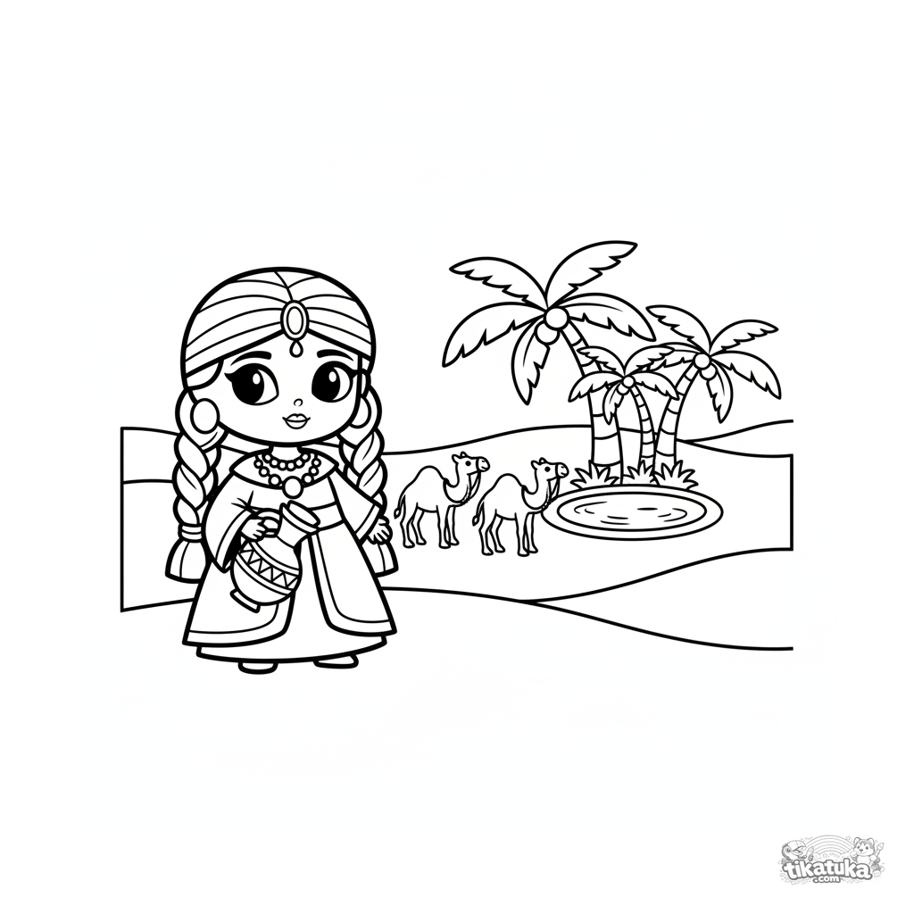 Раскраска для малышей 2-3 лет: пустынная принцесса ведёт верблюдов к оазису с пальмами. Простые крупные формы, мало деталей.