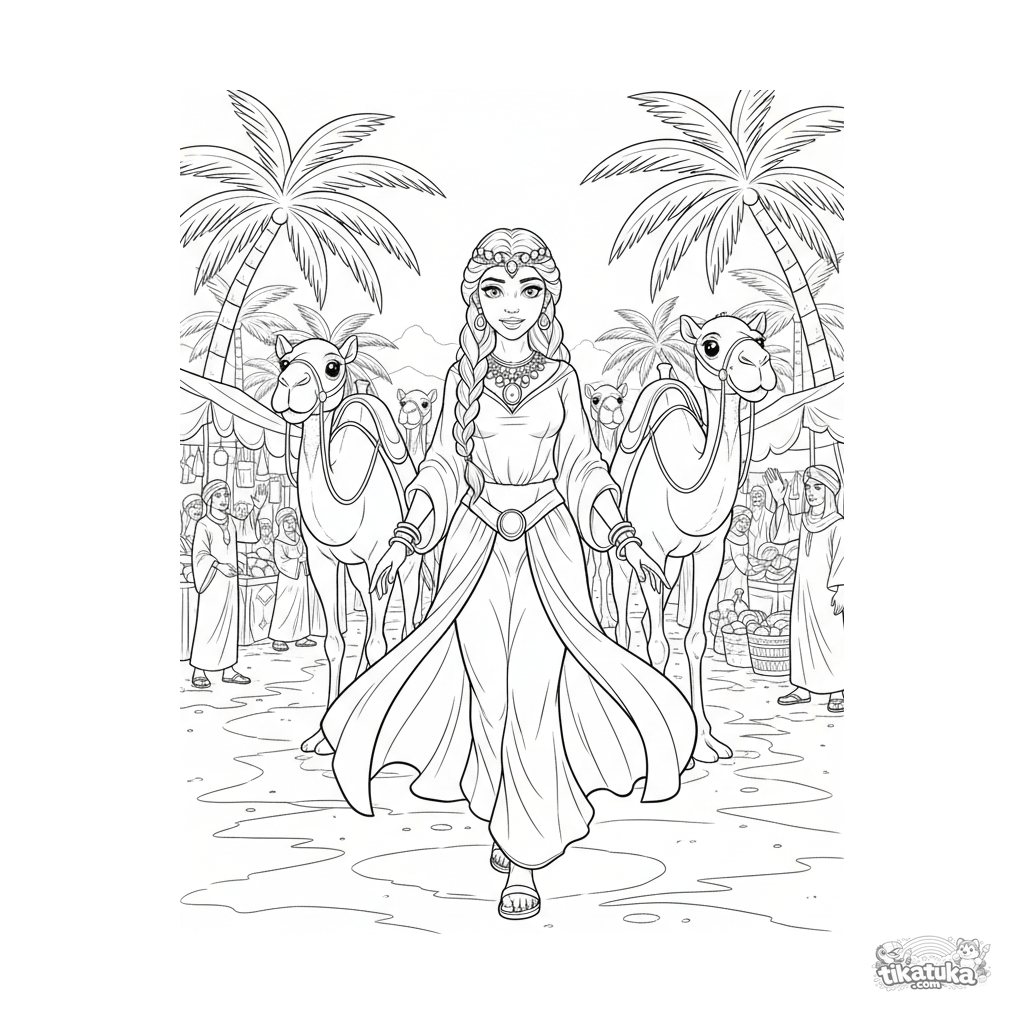 Раскраска для детей 7-9 лет: пустынная принцесса в золотых украшениях ведет верблюдов через оживленный оазис. Сцена праздника и рынка.