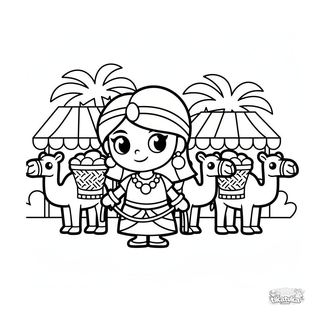 Раскраска для малышей 2-3 года: пустынная принцесса ведёт верблюдов через оазис. Крупные простые формы, чёткие контуры, много места для раскрашивания.