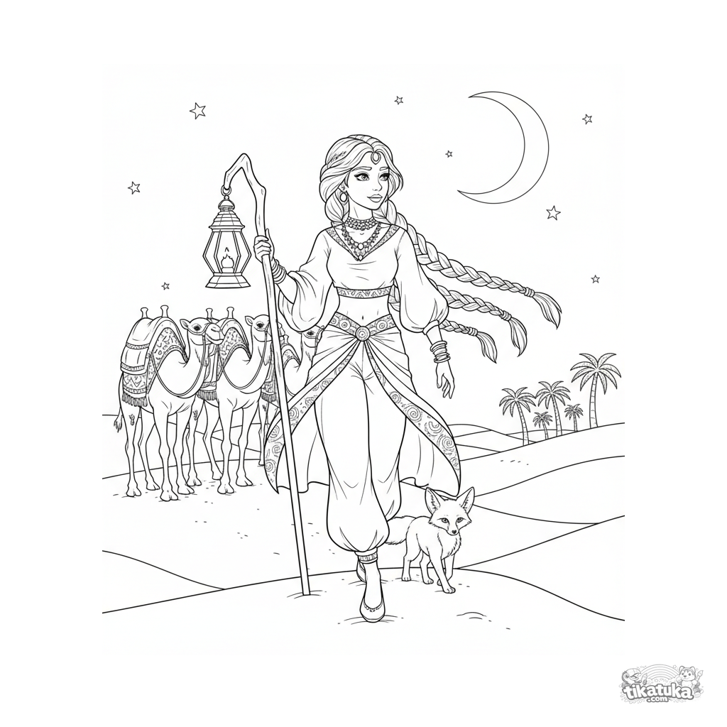 Детальная раскраска для детей 10-12 лет: пустынная принцесса в шелках ведет караван верблюдов через дюны на закате, с посохом-фонарем и лисицей.
