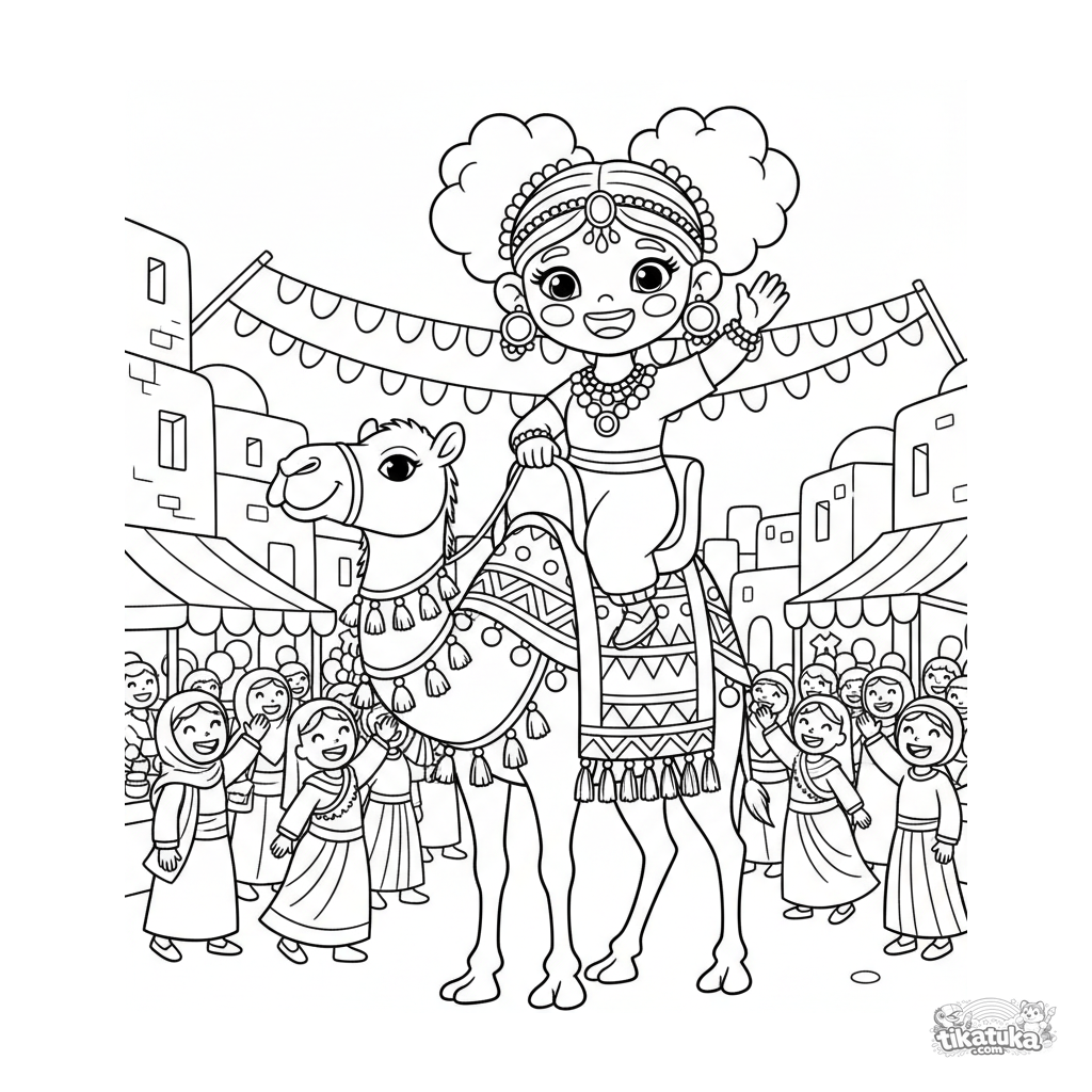 Раскраска для детей 7-9 лет: пустынная принцесса в золотых украшениях ведёт праздничный парад через шумный городской рынок, сидя на украшенном верблюде.