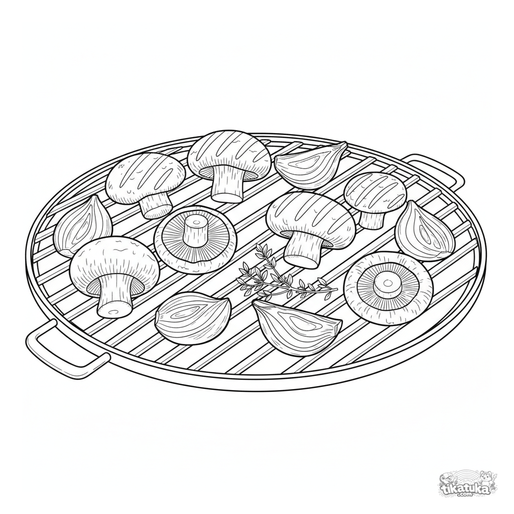 Раскраска для детей 10-12 лет: детальное ассорти из грибов и лука на садовом гриле. Высокий уровень детализации, реалистичные текстуры, чёткие контуры.