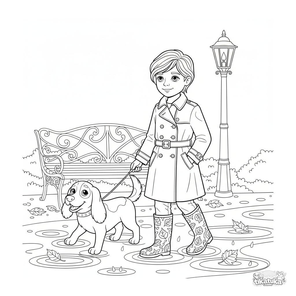 Детальная раскраска для детей 10-12 лет: ребенок в плаще выгуливает собаку под дождем в осеннем парке. Сложная сцена с текстурой дождя и листьев.