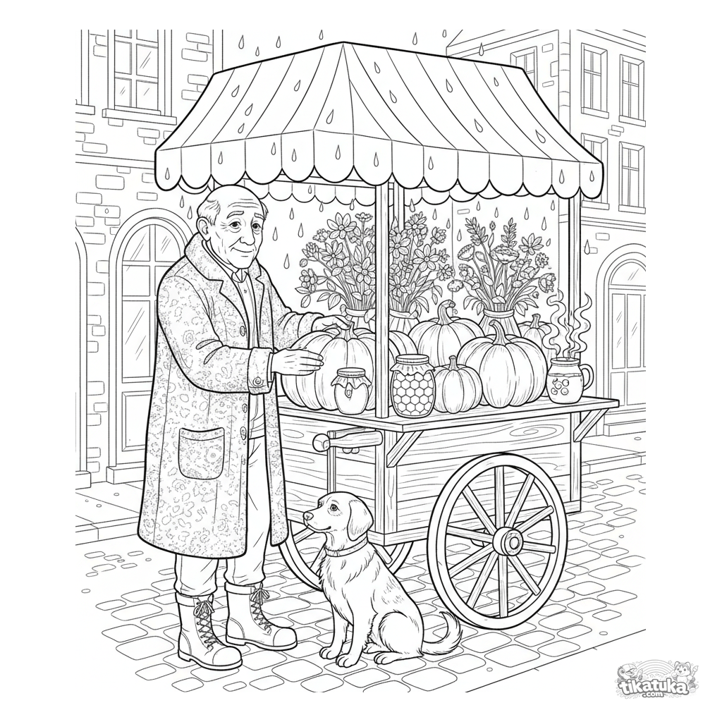 Детализированная раскраска для детей 10-12 лет: уличный торговец с тележкой товаров под навесом в осенний дождь. Богатая сцена с текстурой и атмосферой.