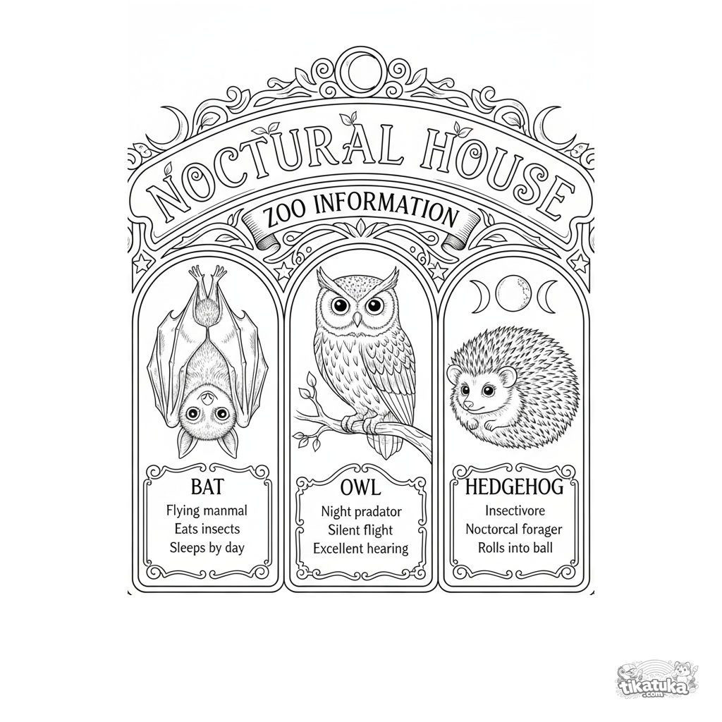 Сложная раскраска для детей 10-12 лет: детализированная иллюстрация информационной таблички 'Ночной дом' в зоопарке в стиле старинной гравюры. Изображены летучая мышь, сова и ёж.