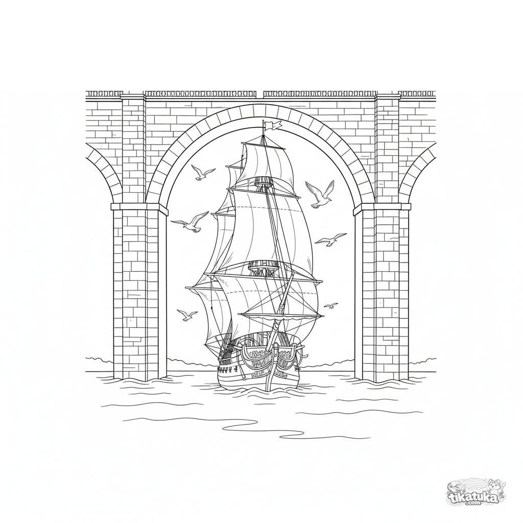 Сложная и детализированная раскраска для детей 10-12 лет: большой исторический парусник проплывает под аркой каменного моста над рекой. Для терпеливых и увлечённых.