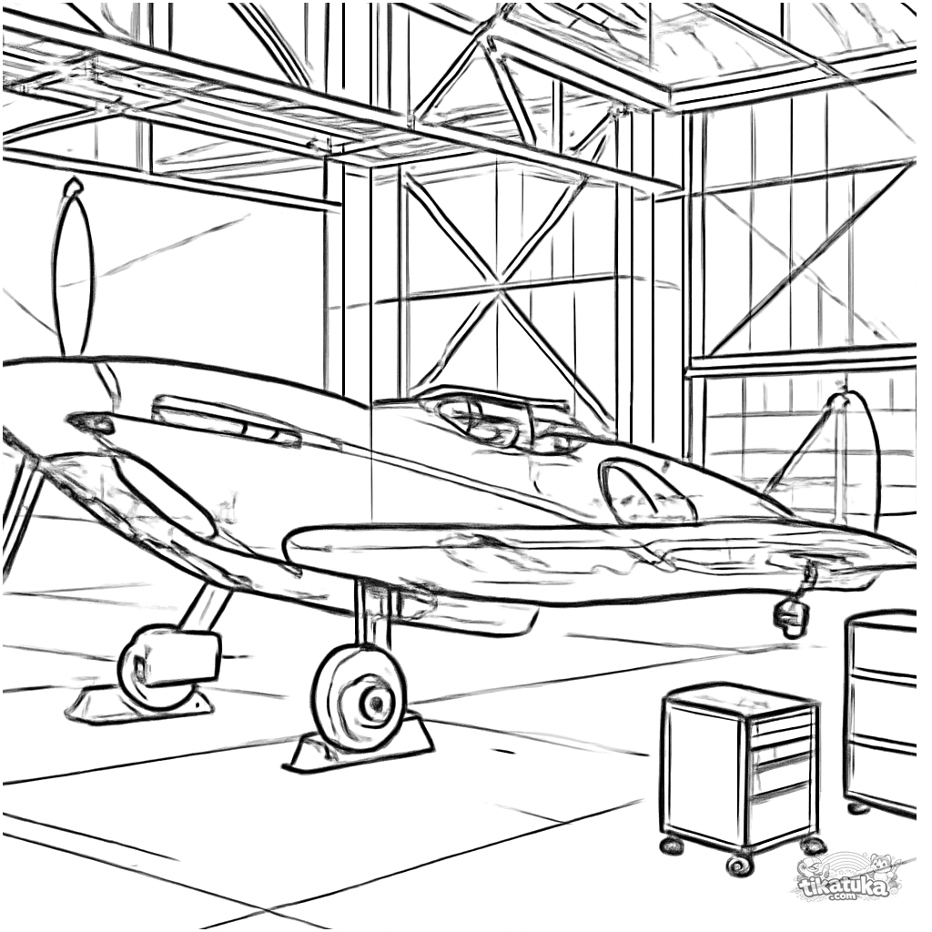 Раскраска: детализированный исторический истребитель Второй мировой войны в ангаре. Для детей 8-12 лет. Реалистичное изображение с оборудованием и светотенью.