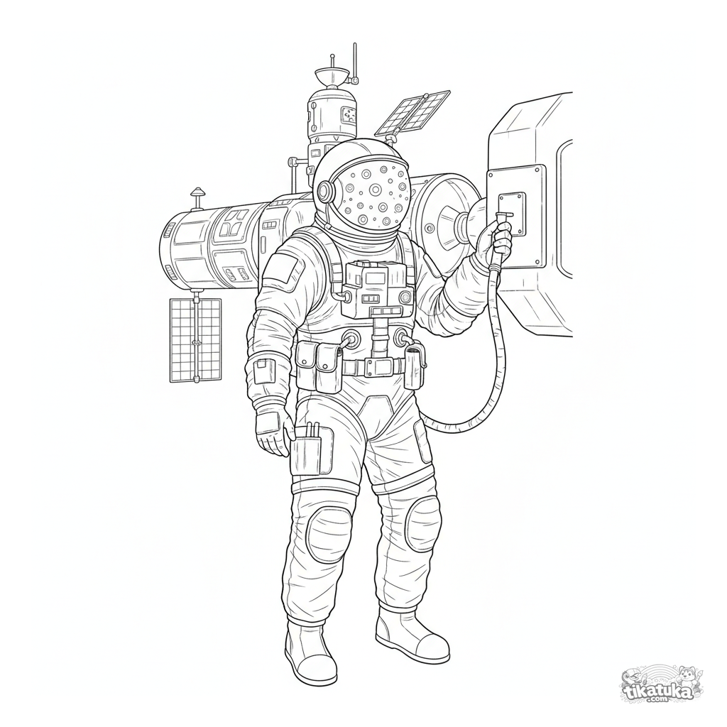 Детальная раскраска для 10-12 лет: космонавт совершает выход в открытый космос для работ на станции среди звёзд. Реалистичное изображение скафандра и оборудования.
