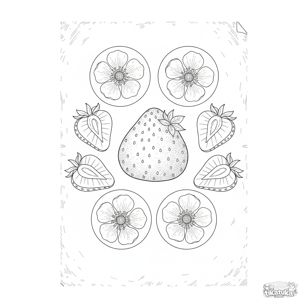 Сложная раскраска в стиле винтажной ботанической иллюстрации. Детальное изображение клубничного моти с диаграммами цветков для детей 10-12 лет.