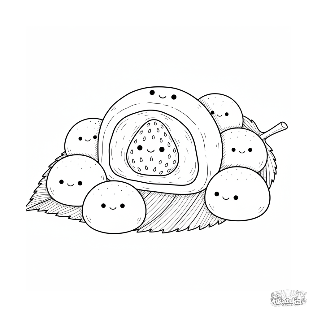Детальная раскраска в разрезе клубничного моти, показывающая начинку из бобовой пасты и ягоды. Образовательный и сложный дизайн для детей 10-12 лет.