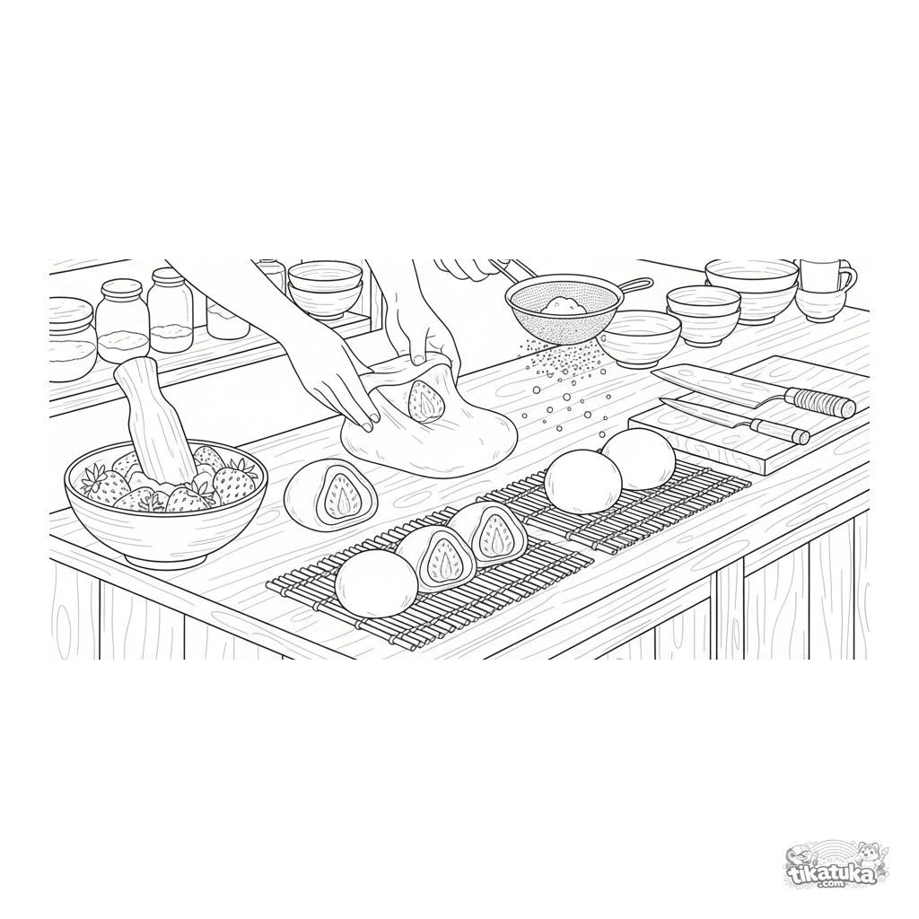 Сложная раскраска для детей 10-12 лет: детализированная сцена производства клубничных моти на кухонном столе, показаны этапы приготовления, инструменты и ингредиенты.