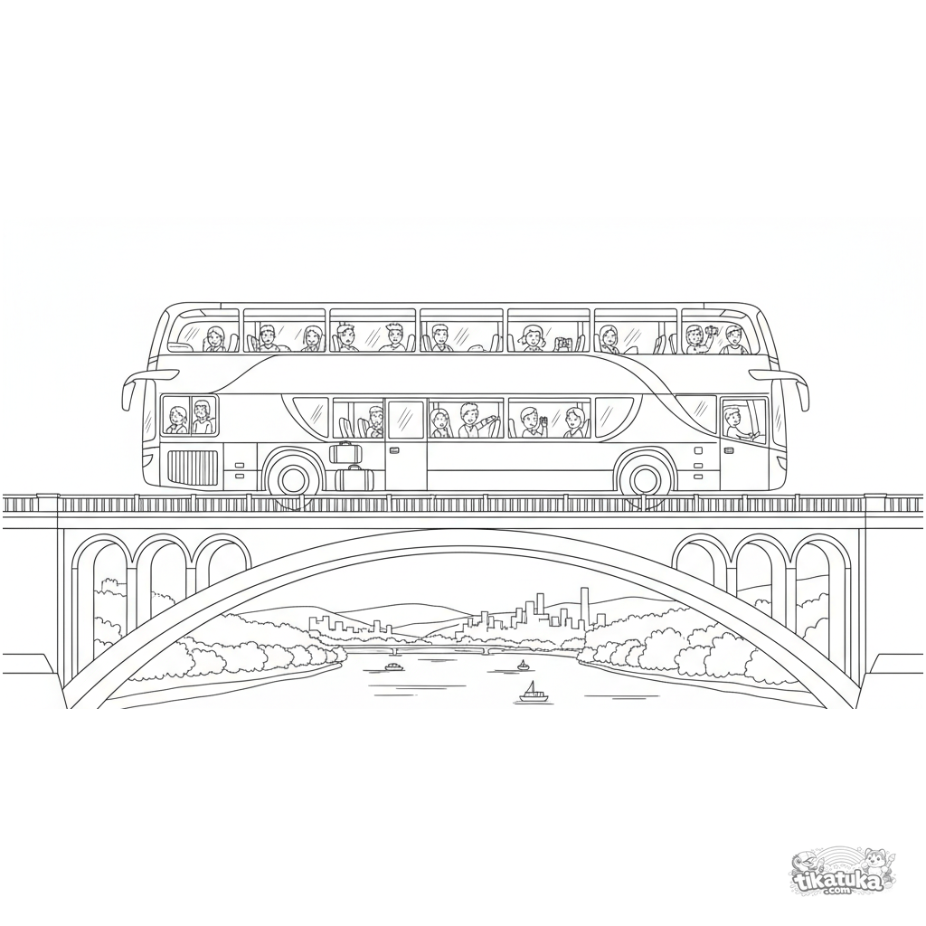 Детальная раскраска для детей 10-12 лет: современный двухэтажный туристический автобус остановился на живописном мосту над рекой. Множество элементов для тщательного раскрашивания.