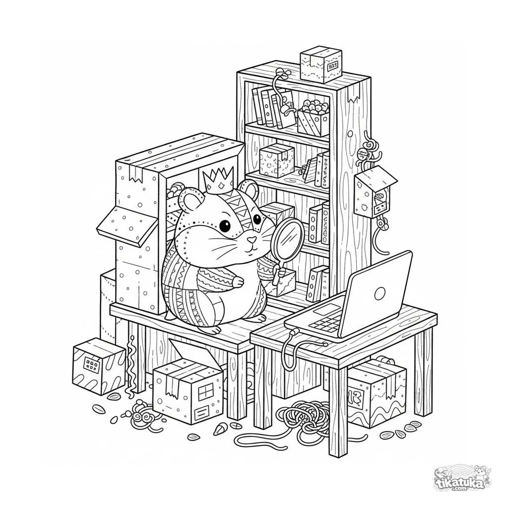 Раскраска в стиле дудлов: решительный хомяк в короне шпионит за ноутбуком с помощью зеркальца из картонной крепости. Забавный и детализированный мем про DIY для детей 10-12.