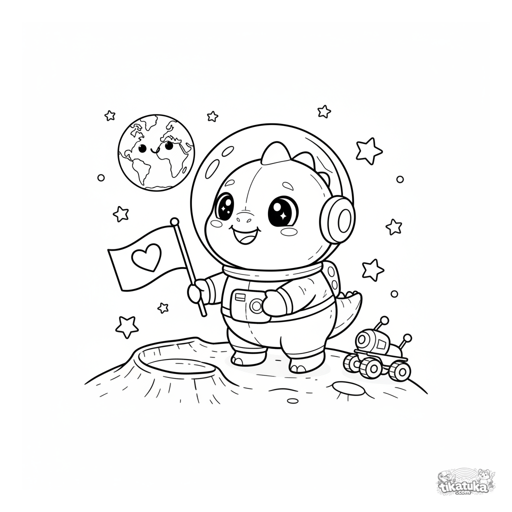 Раскраска с динозавриком-космонавтом, устанавливающим флаг на лунном кратере. Для детей 4-6 лет, веселая и дружелюбная космическая сцена.