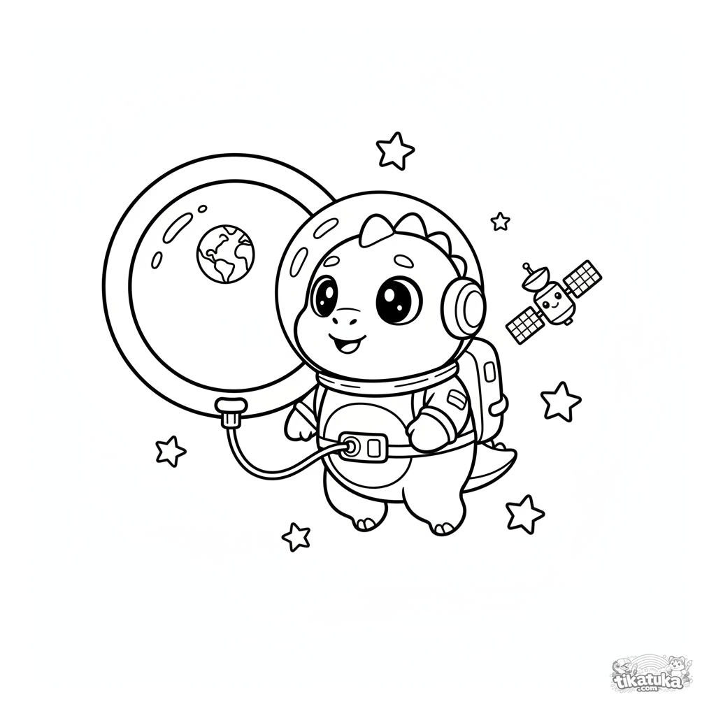 Раскраска для детей 4-8 лет: милый динозавр-исследователь в скафандре совершает выход в открытый космос рядом с космической станцией.