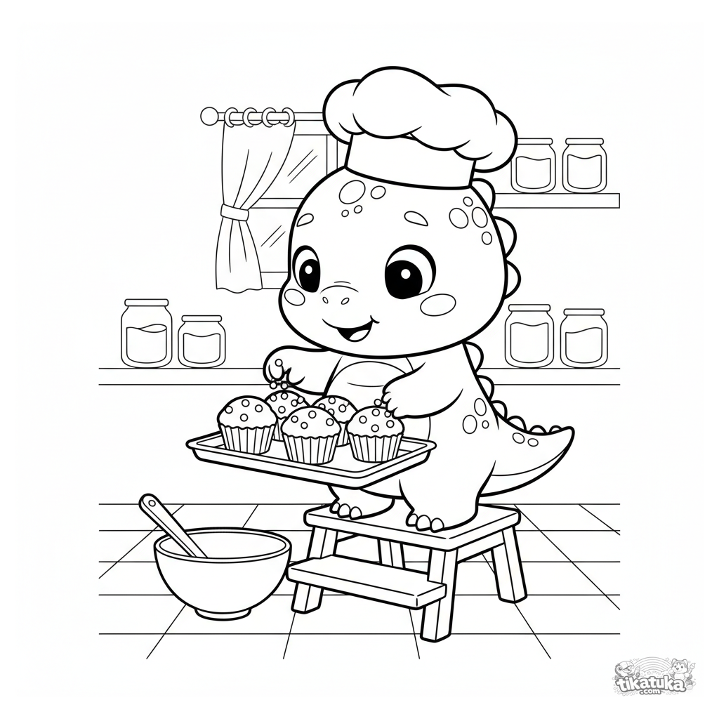 Раскраска для детей 4-6 лет: милый динозаврик-исследователь в поварском колпаке печёт кексы в уютной кухне. Чёрно-белый контурный рисунок для раскрашивания.