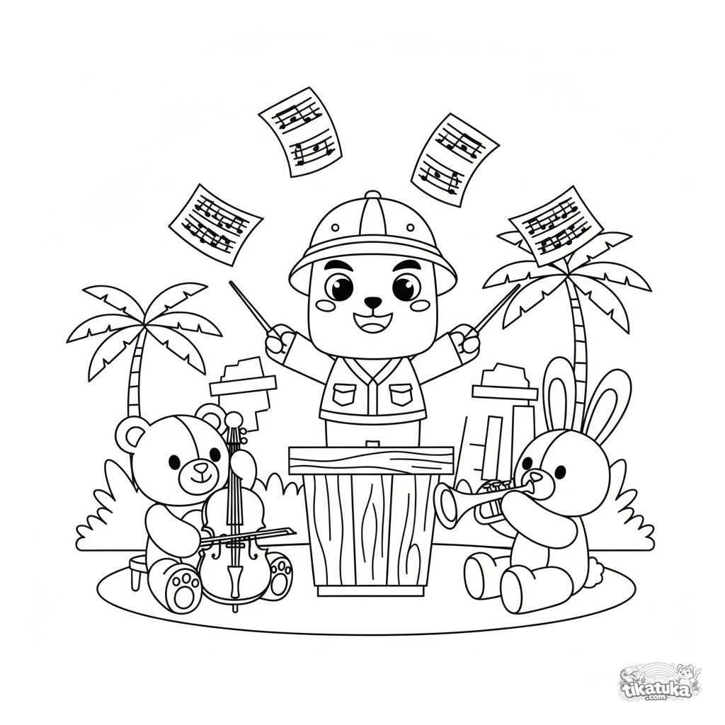 Раскраска для детей 4-6 лет: динозаврик-исследователь дирижирует оркестром из плюшевых игрушек на маленьком подиуме, а вокруг летают ноты.