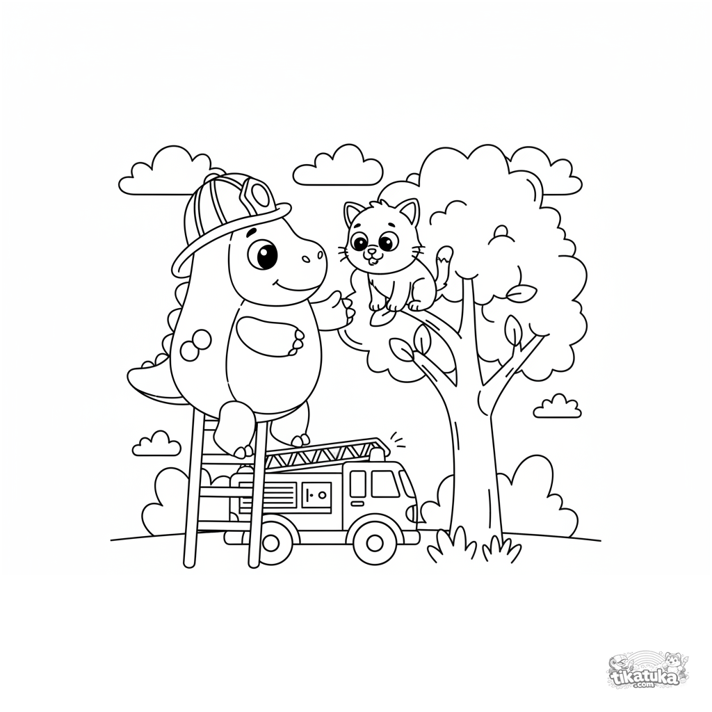 Раскраска для детей 4-6 лет: динозаврик-исследователь в каске пожарного залезает по лестнице на дерево, чтобы спасти испуганного котёнка, внизу ждёт пожарная машина.