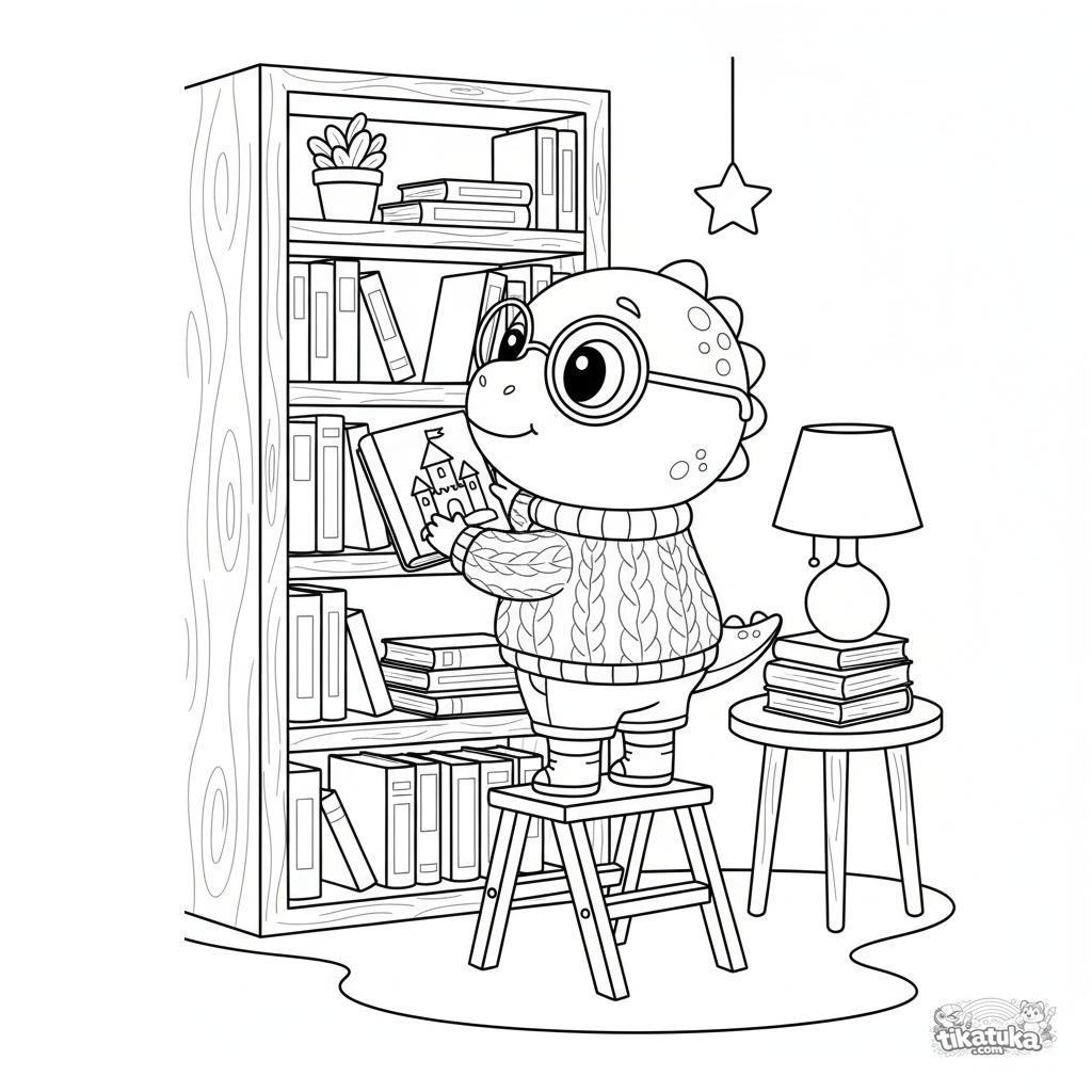Раскраска для детей 5-9 лет: динозавр-исследователь в очках работает библиотекарем, расставляет книги на высоких полках.