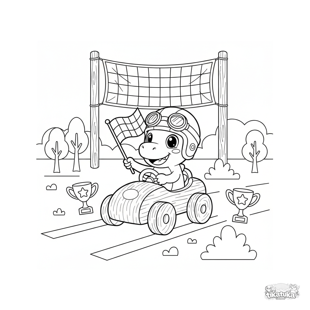Раскраска с динозавриком-гонщиком, празднующим победу на игрушечной гоночной машине. Для мальчиков 4-6 лет, динамичная и радостная сцена.