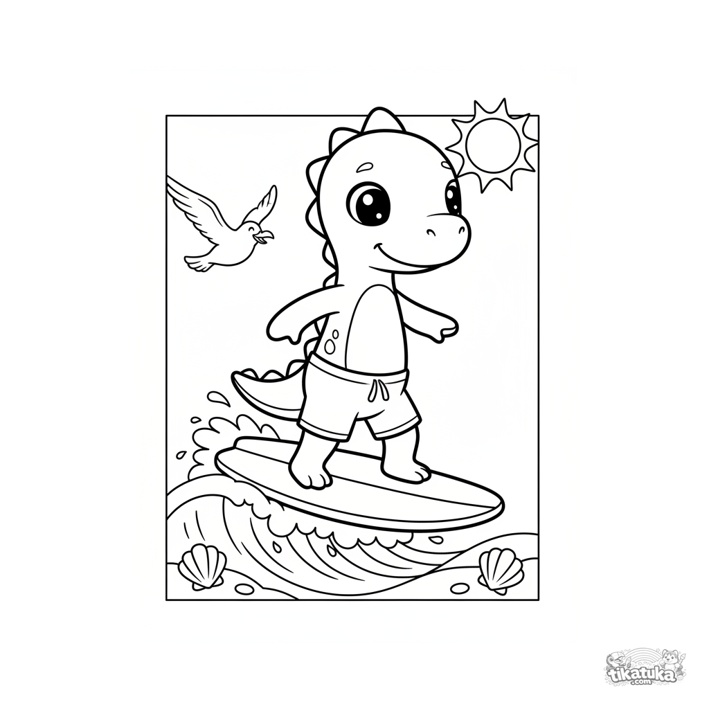 Раскраска для детей 4-6 лет: динозаврик-исследователь в плавках стоит на сёрфборде и катается на маленькой пенной волне у солнечного пляжа, над ним летит чайка.