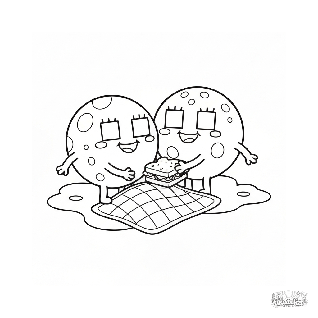 Раскраска для детей 3-6 лет. Два весёлых круглых микроба на пикнике с одеялом и бутербродом. Милый мультяшный стиль для малышей. Скачать бесплатно.