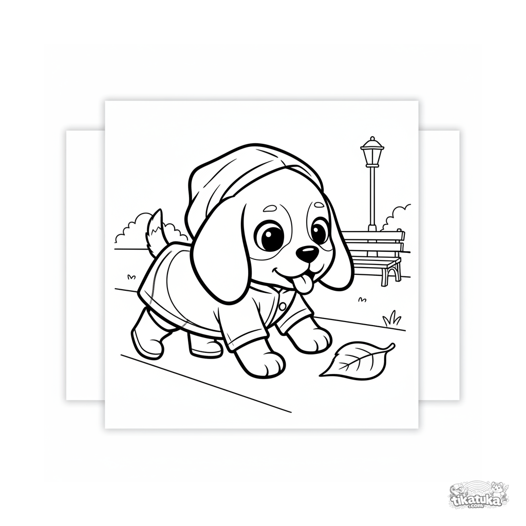 Простая раскраска для малышей 2-3 лет: милый щенок в дождевике и сапожках гуляет по осенней дорожке. Крупные формы, толстые контуры, идеально для первых карандашей.