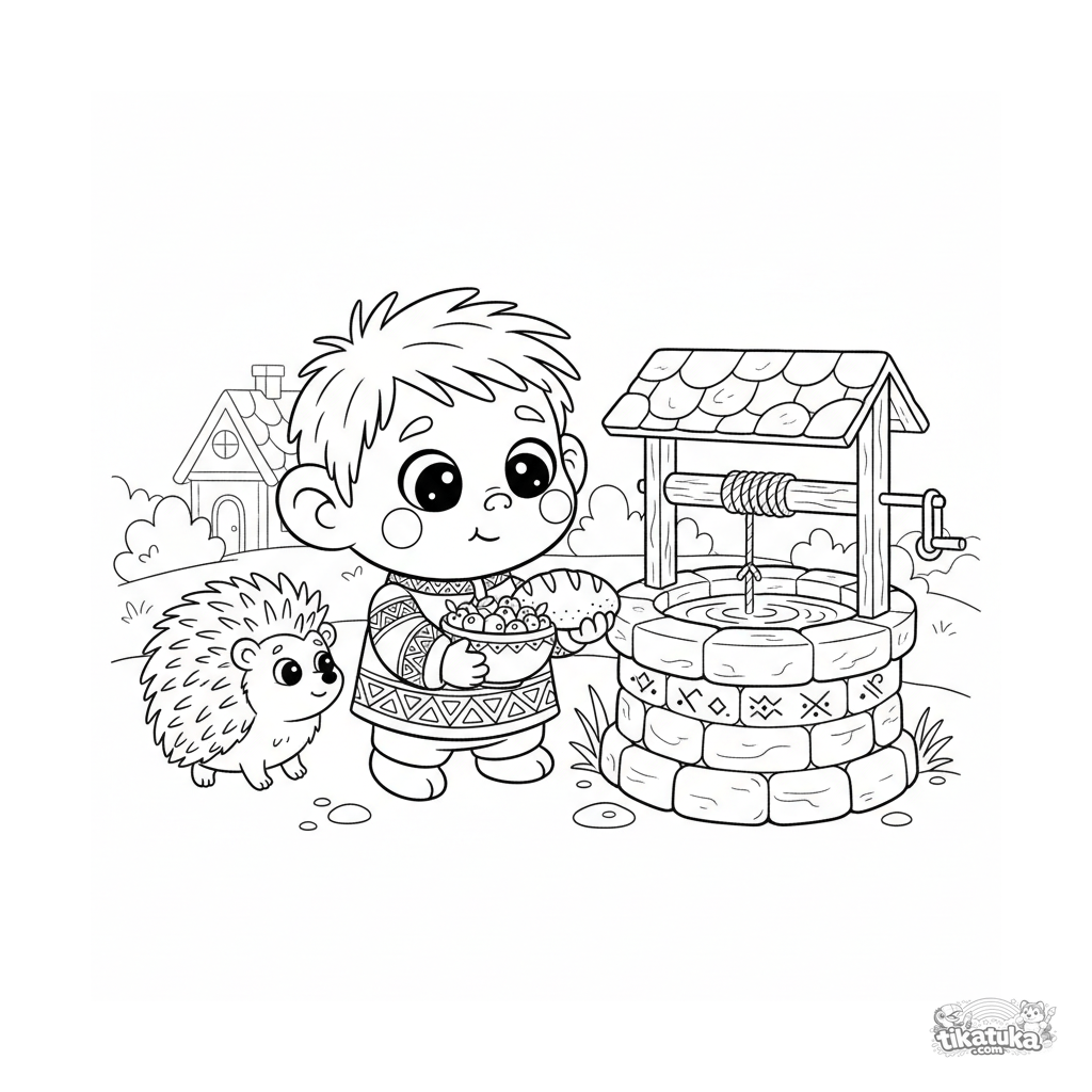 Раскраска для детей 4-6 лет: добрый домовёнок несёт ягоды и хлеб в подарок колодцу с живой водой. Милый фольклорный персонаж с ёжиком.