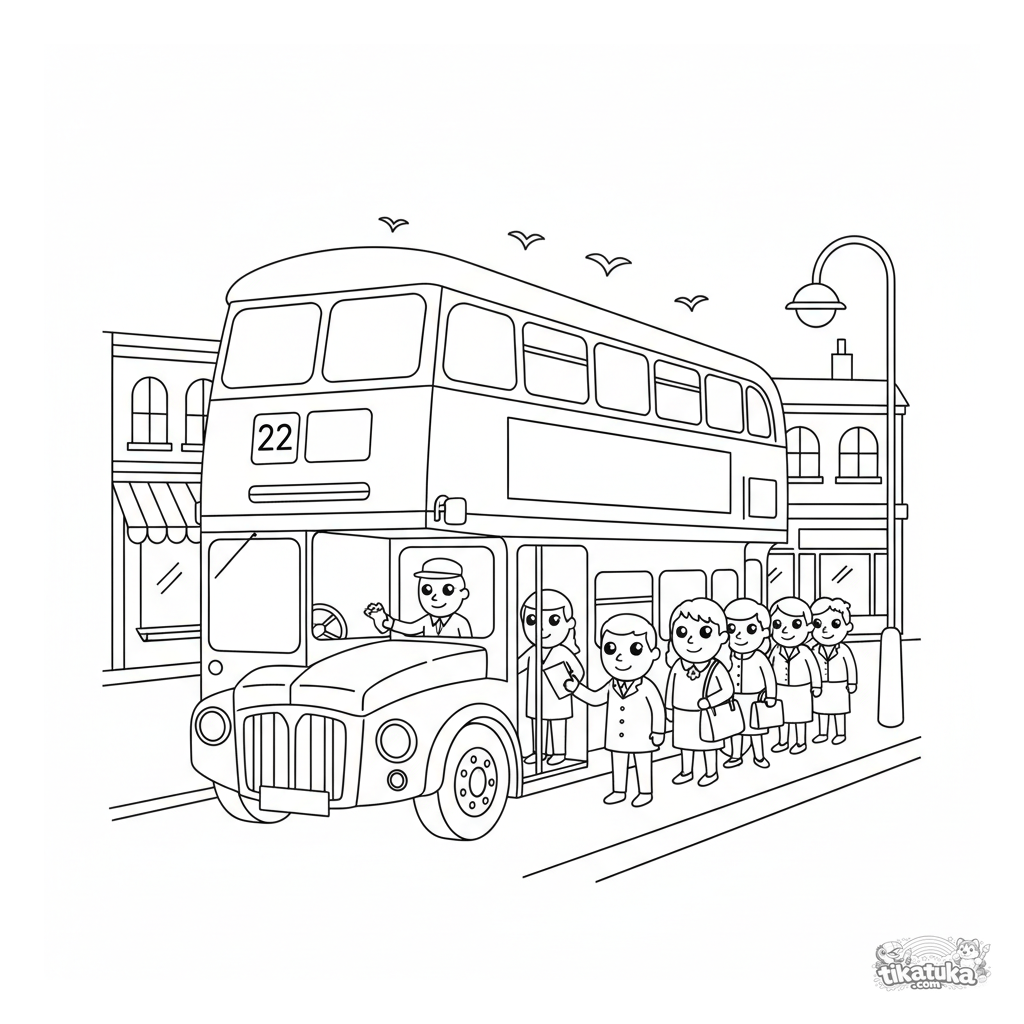 Раскраска для детей: знаменитый двухэтажный автобус стоит на городской остановке, пассажиры заходят внутрь. Видны детали: открытый верх, номер маршрута, кондуктор.