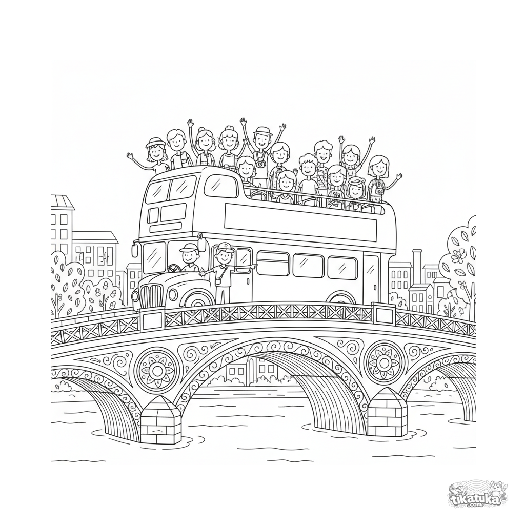 Сложная раскраска для детей 10-12 лет: двухэтажный экскурсионный автобус проезжает по красивому старинному арочному мосту над рекой. Много деталей, городской пейзаж.