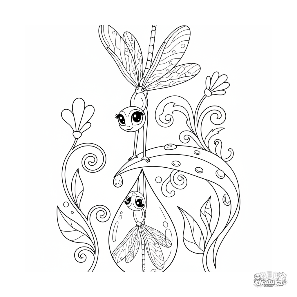 Раскраска для детей 7-9 лет: изящная стрекоза выполняет стойку на кончике листа над каплей росы. Сцена с отражением и декоративными линиями.