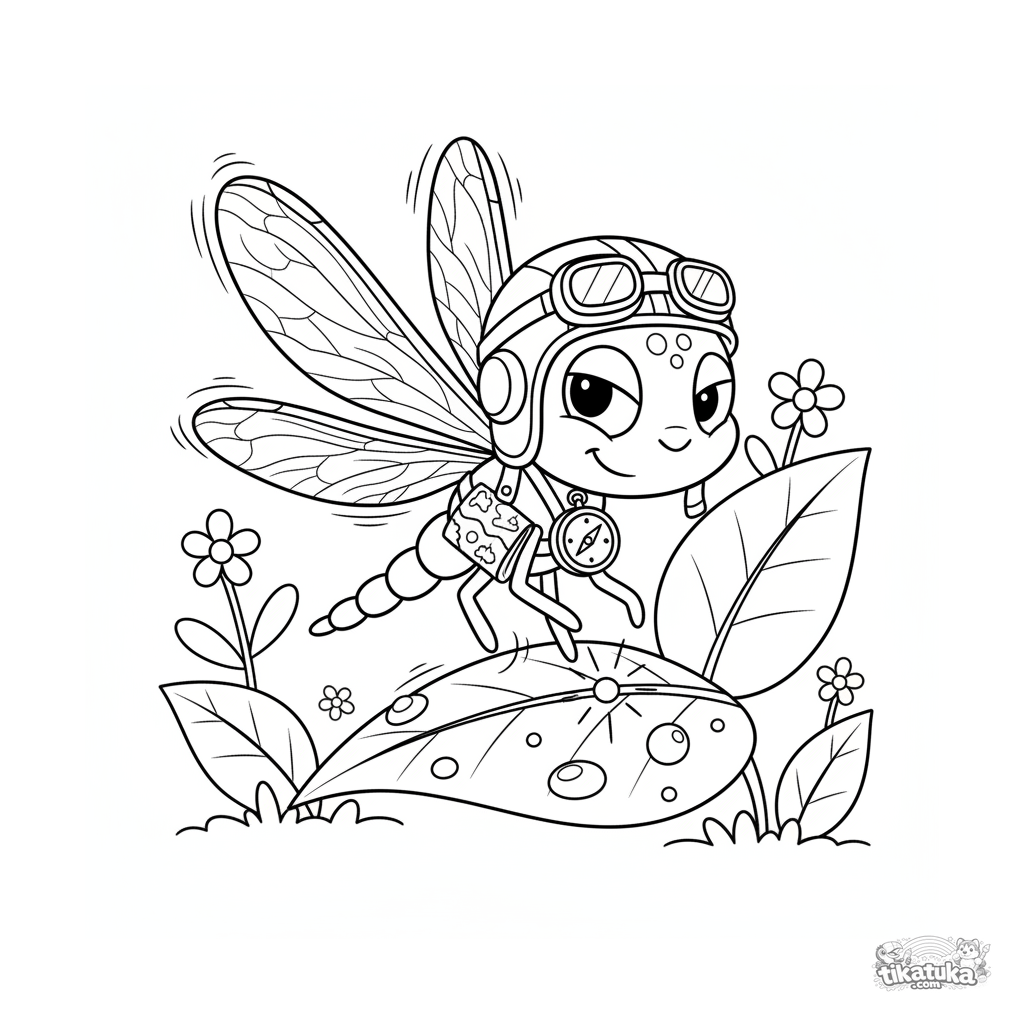 Раскраска для детей 4-6 лет: стрекоза-пилот в шлеме совершает крутую посадку на большой лист с каплями росы. Стиль 80-х мультсериалов.