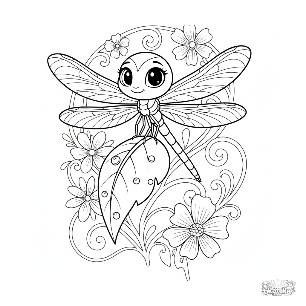 Раскраска для детей 7-9 лет: изящная стрекоза сидит на кончике листа с каплями росы. Плавные линии, декоративные детали крыльев.