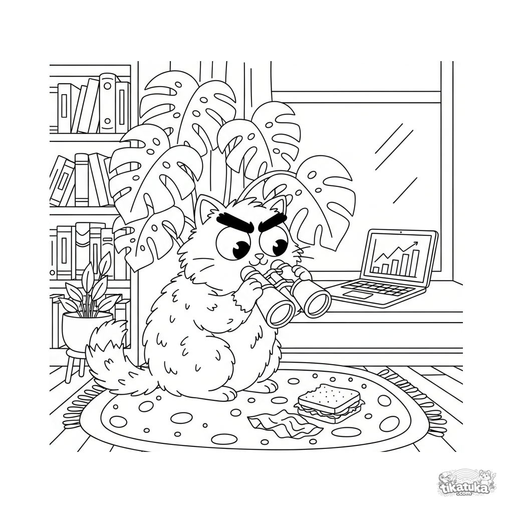 Раскраска для детей 10-12 лет: драматичный кот, шпионящий из-за комнатного растения с биноклем, высматривает зарплату на ноутбуке. Детализированная смешная сцена.