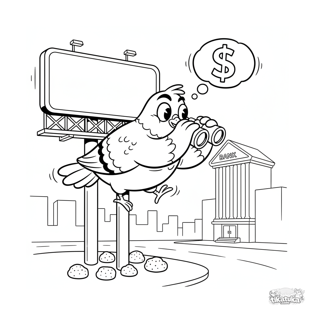 Раскраска для детей 10-12 лет: драматичный голубь на рекламном щите с биноклем высматривает банк. Смешная городская сцена в стиле ретро-мультфильма.