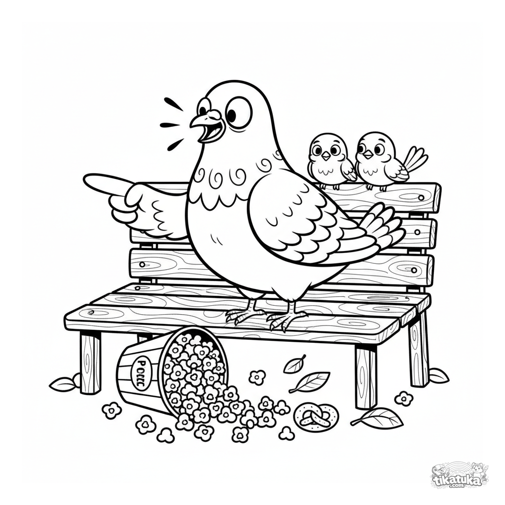 Раскраска для детей 7-12 лет: драматичный голубь указывает на рассыпанный попкорн на скамейке в парке. Смешная реакционная сцена в стиле интернет-мемов.