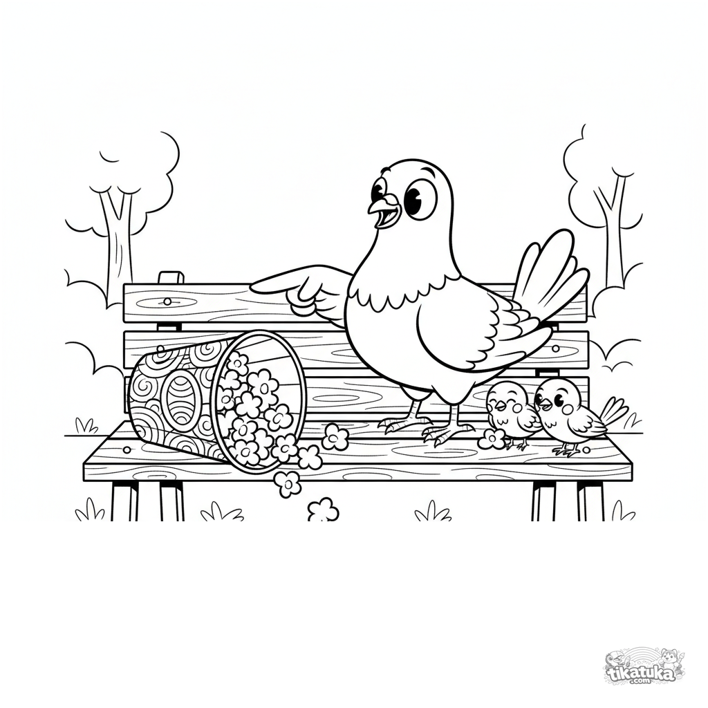 Раскраска для детей 7-12 лет: драматичный голубь с преувеличенной реакцией указывает на рассыпанный попкорн на скамейке в парке. Смешная сцена в стиле интернет-мемов.