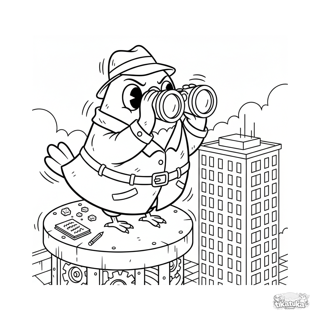 Раскраска для детей 10-12 лет: драматичный голубь-детектив в плаще на крыше офиса высматривает что-то в бинокль. Смешной мем-сюжет с деталями.