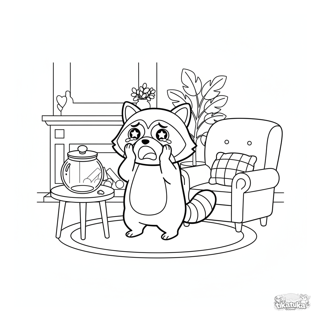 Раскраска для детей 7-12 лет: драматичный енот с преувеличенной реакцией на пустую банку с печеньем в уютной гостиной. Сцена в стиле реакционного мема.