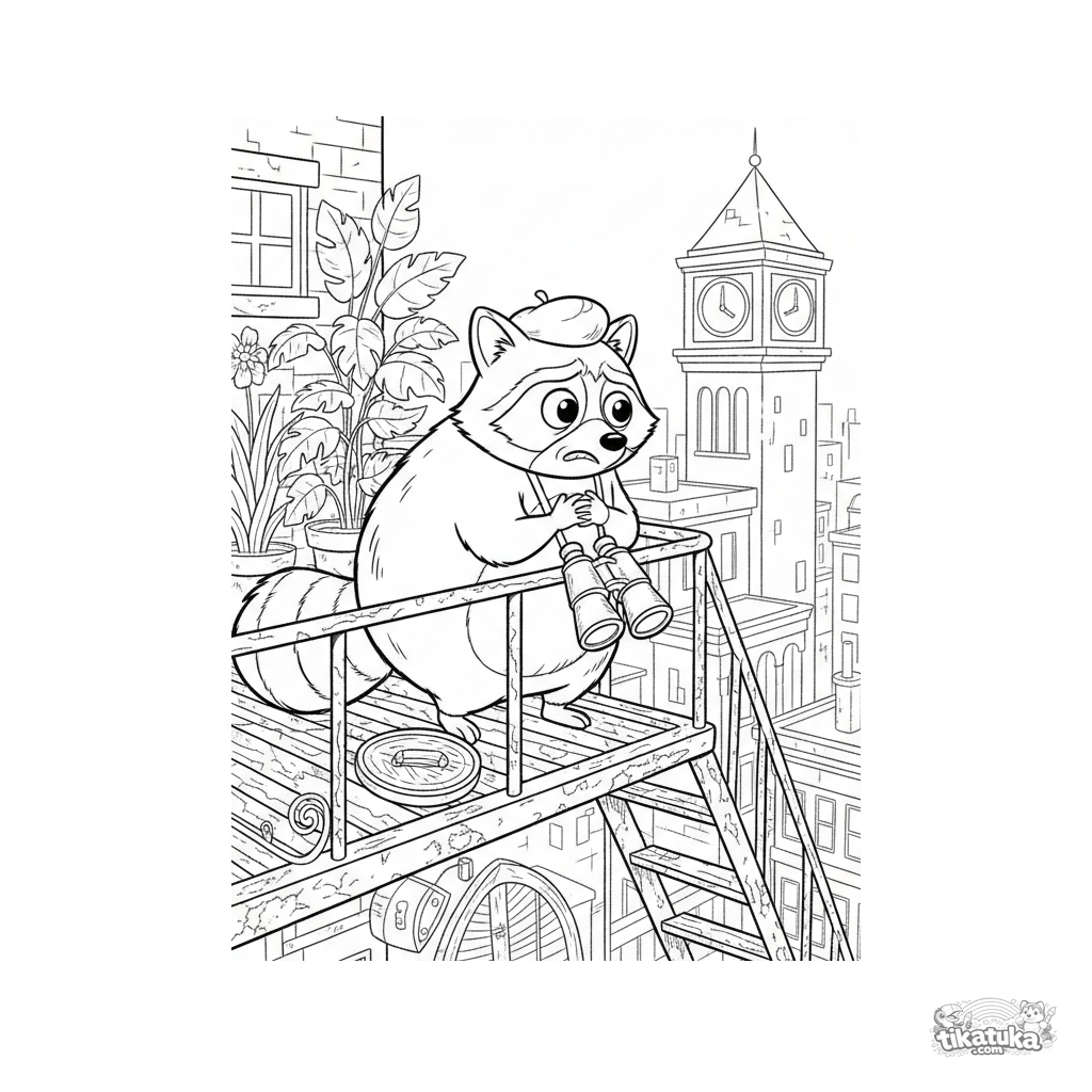 Раскраска для детей постарше: драматичный енот в берете на пожарной лестнице с биноклем, тоскливо смотрит на часы банка. Детализированная городская смешная сцена.