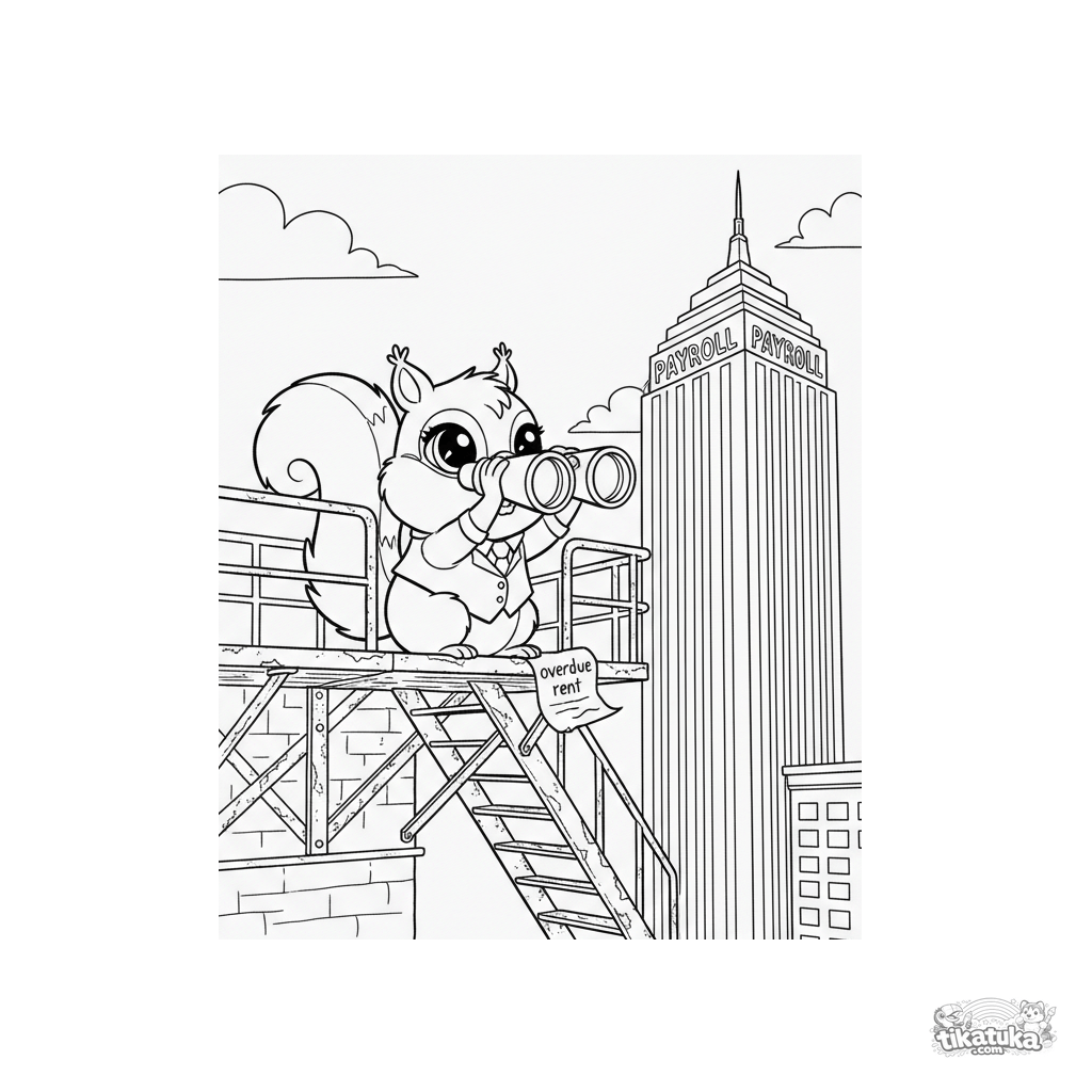 Раскраска для детей 10-12 лет: драматичная белка в жилете на пожарной лестнице с биноклем высматривает зарплату. Смешной мем-сюжет с деталями офисного здания.