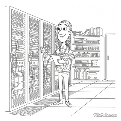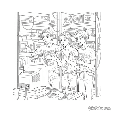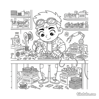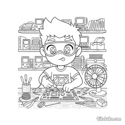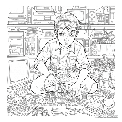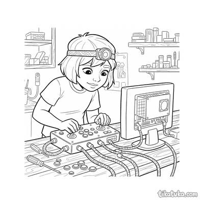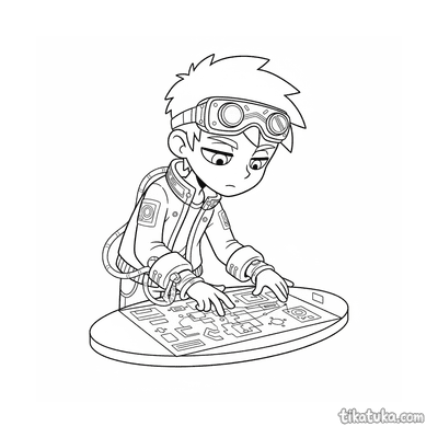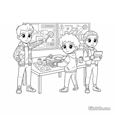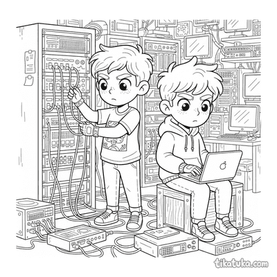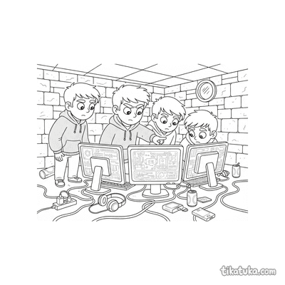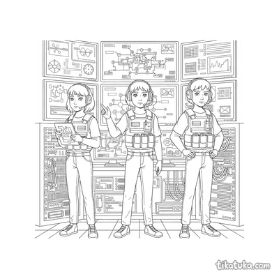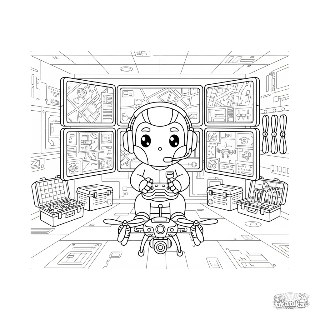 Раскраска для детей 10-12 лет: оператор управляет дроном с помощью пульта и мониторов в подвальном центре управления. Техническая сцена в стиле чертежа.