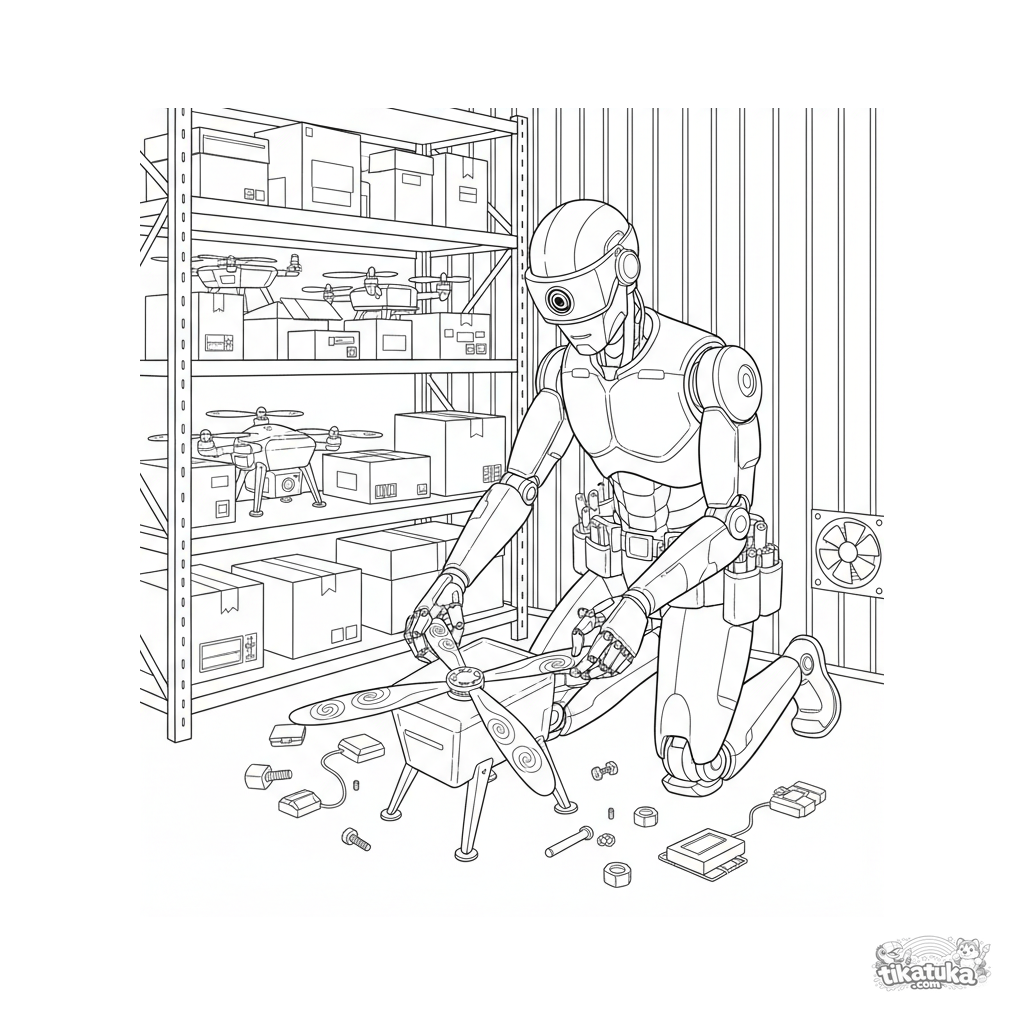 Детализированная раскраска для детей 10-12 лет: робот-механик в стиле научной иллюстрации ремонтирует дрон на складе среди ящиков с запчастями.