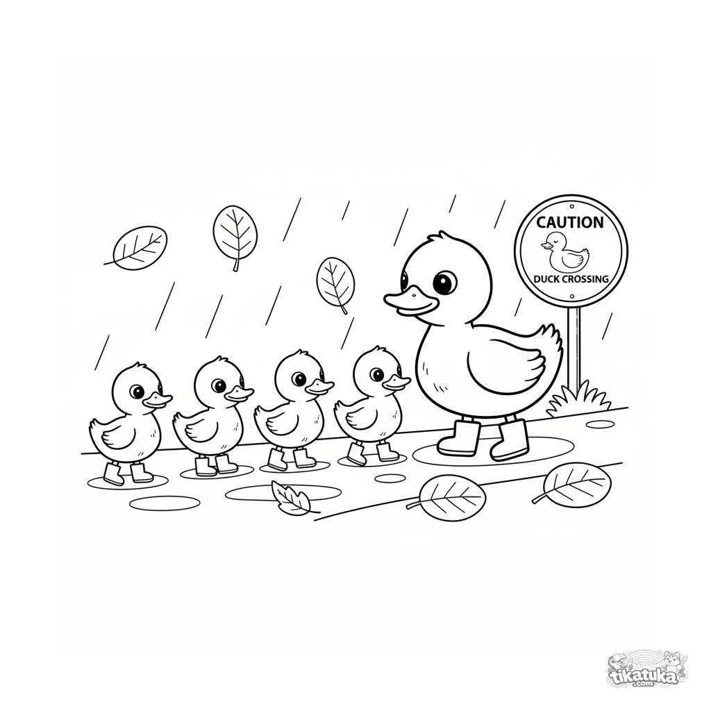Раскраска для малышей 2-3 лет: семья пушистых утят в сапожках переходит мокрую дорогу под осенним дождём. Очень простые формы, большие области для раскрашивания.