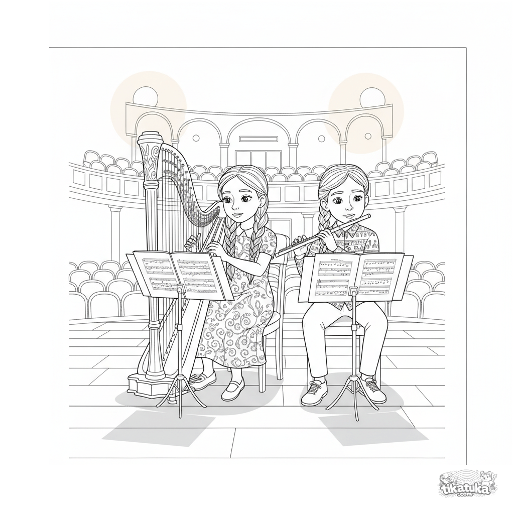 Сложная раскраска для детей 10-12 лет: дуэт юных музыкантов, играющих на арфе и флейте, на большой сцене концертного зала.