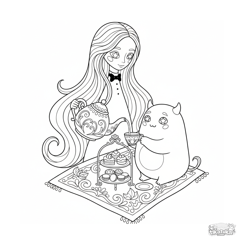 Раскраска для детей 10-12 лет: элегантный монстр в стиле ар-нуво наливает чай из гигантской чайника на изысканном пикнике. Детализированная сцена с друзьями.