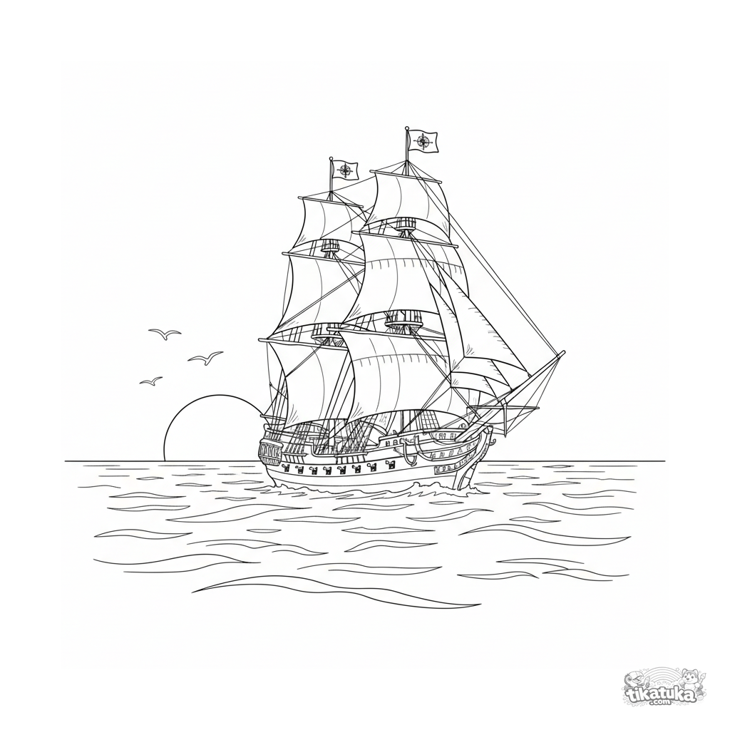 Сложная раскраска для детей 10-12 лет: элегантный парусник с детализированной оснасткой плывёт по спокойному морю на фоне заката. Сцена в стиле акварельного скетча.